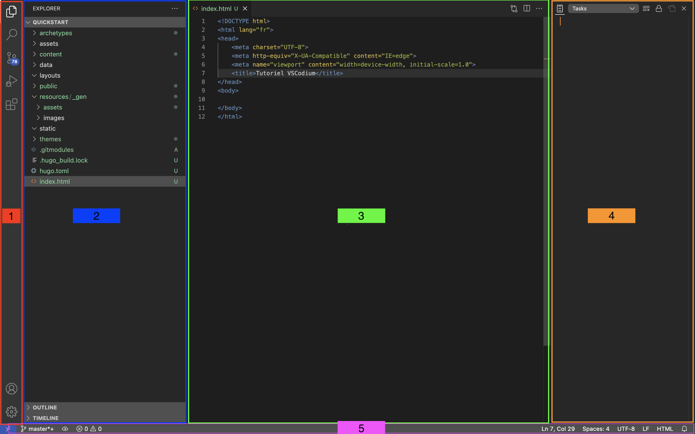 On y trouve notamment des informations sur la gestion des sources, les erreurs ou avertissement du projet, la ligne et colonne du curseur et des informations relatives au fichier : nombre d’espaces par tabulation, encodage, caractère de fin de ligne et le format de fichier que VSCodium a détecté.